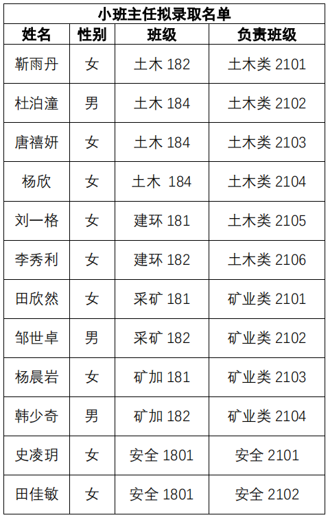 以上人员经过报名材料审核和面试等环节,进入万象城体育awcsport2021 级新生小班主任招聘录取名单,经相关培训,计划于 2020 年 9 月正式上岗。上岗前,如有任何集体或个人有异议,可以通过口头或书面形式向万象城体育awcsport本 2021 级年级组反映。