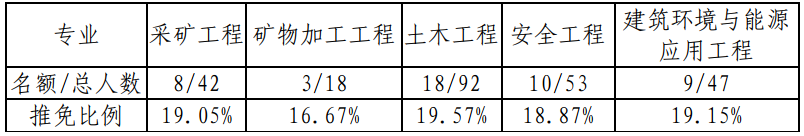 根据《关于做好2021届优秀本科毕业生推免工作的通知》(教通知[2020]122号),我院推免名额共计48人(矿冶学科本硕贯通培养名额由教务处单独核算),按照各专业现有人数252人(不含艺术特长生、民考汉、内地班等),推免名额分配如下: