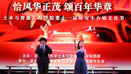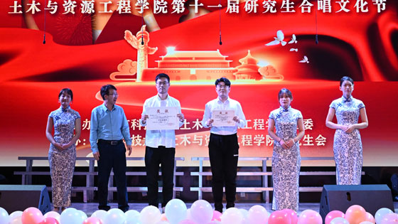 随后,晚会以研究生班级为单位依次进行竞演,分为歌曲合唱和风采展示两个环节,此次共有10个班级参赛。合唱上半场分别是土木硕2102班、矿加硕2105班、采矿硕2107班、安全硕2108班以及地矿硕2106班带来合唱歌曲和风采展示,师生们动情的演唱、丰富的演出,生动展现了新时代青年坚定的理想信念与深沉的爱国情怀,也蕴含着对祖国未来的美好祝愿。