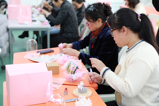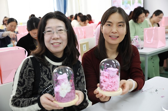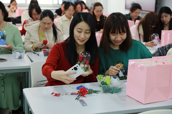 2024年国际“三·八妇女节”,万象城体育awcsport组织女教工进行永生花手工制作活动,现场有近五十位老师参加了活动,学院准备了“奶绿”、“茶白”、“蓝调”、“樱粉”等近十主题的永生花花材,以及剪刀、胶水、包装袋等,现场对永生花的制作进行了简单培训。
