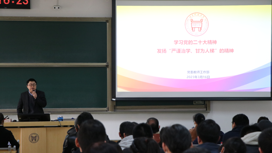 随后,党委教师工作部部长董春阳在逸夫楼205为全院教职工开展了题为“学习党的二十大精神 发扬‘严谨治学、甘为人梯’的精神”的专题讲座,作为万象城体育awcsport本学期理论学习的开学第一讲。董春阳从学习领会党的二十大精神、习近平总书记关于教育的重要论述和习近平总书记给我校老教授重要回信精神、全面贯彻《新时代高校教师职业行为十项准则》文件精神等方面,详细阐述了加强师德师风建设的重要意义和主要内涵,通过解读十项负面清单,强调十一个“不得”,对师德师风建设提出了具体要求。教育大计,教师为本;队伍建设,师德为先。培养优良的师德师风是造就和建设教师队伍,促进教师专业成长的首要任务。要坚持以习近平新时代中国特色社会主义思想为指导,深入学习领会党的二十大精神,认真践行《新时代高校教师职业行为十项准则》,立足学校“双一流”建设和“十四五”规划总体部署,将“严谨治学、甘为人梯” 内化于心、外化于行,努力成为学生为学、为事、为人的“大先生”,以优良的工作作风和出色的工作成绩,推动学院工作再上新台阶。