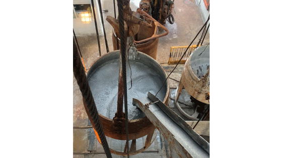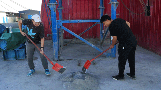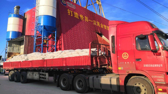 2020年9月16日,团队成员与莱州汇金矿业投资有限公司袁永忠董事长、王秀会副总经理等,针对新型井壁材料浇筑过程中可能出现的技术问题进行深入探讨,并对现场施工人员进行了搅拌工艺和配合比等关键步骤的交底工作。9月18日完成了原材料运输装卸(图1)、混凝土拌合物和易性验证试验(图2)和井下模板安装等前期重要工作。