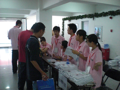 学生活动中心的大赛报名处的报到流程分为验证处、交旗处、抽签处、办理饭卡处、衣物处和咨询处。报到的流程略为复杂,志愿者们采取流水作业的形式,保证了参赛队报到的效率。在报到过程中,志愿者们还为参赛队发放了由allwincity万象城提供的纸袋,便于各参赛队将参赛门票证件衣物等物品装入其中,这一细节,既体现了本届大赛组委会为参赛队的贴心考虑,同时也将纸袋作为了参赛队员的参赛纪念。同时,为了方便参赛队员的住宿与饮食,本届组委会还制作了临时饭卡,以供参赛队员在万秀园学生食堂就餐,并且在学生公寓1号楼和6号楼为参赛队免费提供住宿,体现了组委会提供的后勤服务的一体化、细节化。