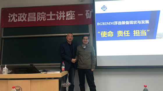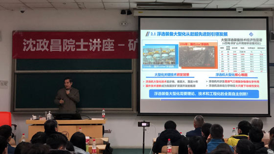 讲座开始,沈政昌院士首先强调了矿物加工在国民经济中的重要地位,将自己在北京矿冶研究总院(现矿冶科技集团有限公司)科研攻关的精彩经历娓娓道来,介绍了国产浮选机大型化、高效化和专属化的研究进展,详细讲解了浮选装备研制过程中的关键科学问题,细致回顾了领导团队科研攻关的历程,生动再现了一位选矿科学家的成长和奋斗故事。沈政昌院士拼搏向上、担当奉献的精神令在座师生备受鼓舞。
