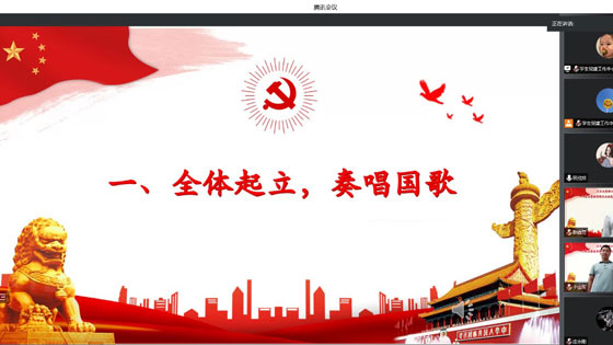会议第一项,奏唱国歌。全体参会师生起立,行注目礼。