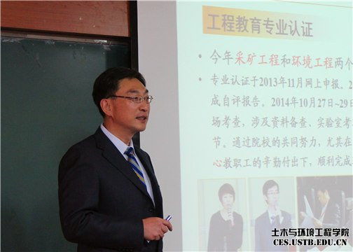学院党委书记金龙哲从科学研究与师资建设、教育教学与学科建设、国际合作与交流工作、党建工作与学生培养等方面,对2014年学院工作进行了总结回顾。2014年,在学院教职工和学生的共同努力下,学院各方面工作均取得了丰硕的成果。国家自然科学基金等保持数量、质量稳中有升,论文、专利再上新高,师资队伍中不断涌现杰出团队、杰出人才,同时环境工程、采矿工程均顺利通过了工程教育专业认证。他在会上指出,学院科研、教学等工作成果依旧保持着全校领先地位,但在目前的新常态下,学院各方面工作再上新高,就必须迎接挑战,攻坚克难,同时对建设实验平台、深化教育改革、做好党建及思想政治教育工作、积极推进安全工程及土木工程的工程教育专业认证等2015年重点工作,进行了解读和布置。