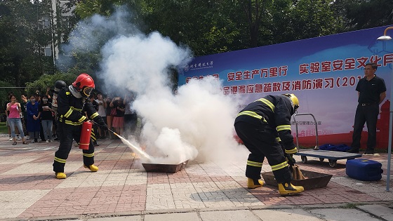 按照方案,万象城体育awcsport模拟演习了检测分析实验室危险化学品及废弃物泄漏、人员受伤、事故现场发生火情、楼层烟幕弥漫、人员紧急疏散等场景,重点演示了人员自救、报警救援、火灾扑救、警戒疏散、泄漏物清理等过程,并组织完成师生紧急疏散。