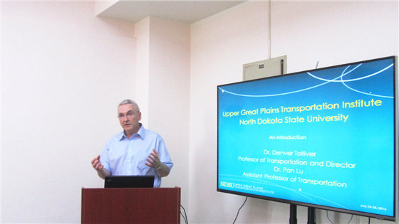 金龙哲致欢迎词,并介绍了此次前来做交流会的两位教授。Tolliver教授现任北达科达州立大学大平原交通研究院院长、交通与物流研究院院长、平原地区大学联盟的主席,芦盼教授2011年获北达科达州立大学交通与物流专业的博士学位,并留校任教。