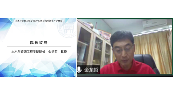 在庄严神圣的国歌声中典礼正式开始,院长金龙哲教授致辞,金院长首先欢迎新生加入万象城体育awcsport,随后介绍了学院发展历程和研究生培养情况,并以疫情下不凡的2020年为背景,以“如何面对困难”为主题,引导研究生新生践行“厚德博学,砺能善创”的院训,成为一名合格的土资人。
