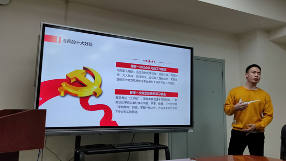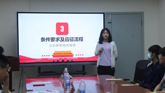 秦梦丽同学以自己的参军经历为切入点,结合去年征兵工作的特点,重点说明了大学生参军的应征流程和相关要求,鼓励同学们积极投身国防事业,坚定追逐自己的梦想。