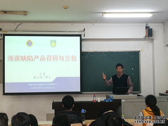 应我院安全科学与工程系书记黄国忠老师的邀请,国家质检总局缺陷产品管理中心主任王琰博士莅临我院,在土木楼302室做了题为“浅谈缺陷产品召回与三包”的学术讲座,黄国忠老师担任本次讲座的主持人,安全科学与工程系2016级研究生聆听了此次学术报告。