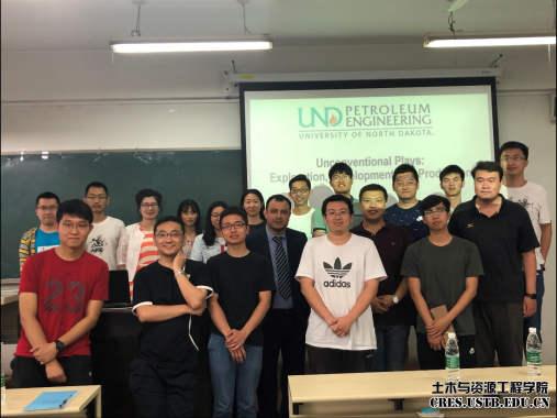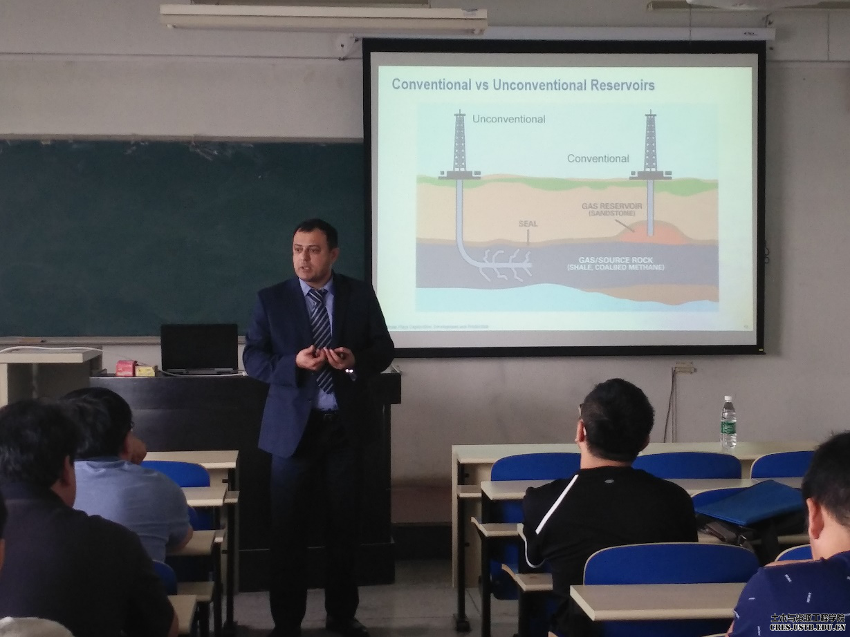 首先,Vamegh Rasouli教授代表北达科他州大学,分别介绍了学校整体概况、系所设置等基本情况。之后,Vamegh Rasouli教授开始了题目为“Shale gas exploration, development and production: the status in the USA and potentials in China” 的报告。Vamegh Rasouli教授就页岩气的应用前景,以及开发中的环境保护等方面与同学们进行了深入的交流。同学们在与Vamegh Rasouli教授的积极互动中,收获颇深。