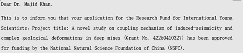 近日,我校外籍教师Majid Khan博士获批国家自然科学基金外国学者研究基金项目。外国学者研究基金是国家自然科学基金委特别设立的一项极具竞争力的基金项目,旨在支持在中国工作的优秀外籍学者开展前沿研究工作,加强中国与国际科学家之间的学术合作与交流。据悉,国家自然科学基金外国学者研究基金项目每年仅100余项。